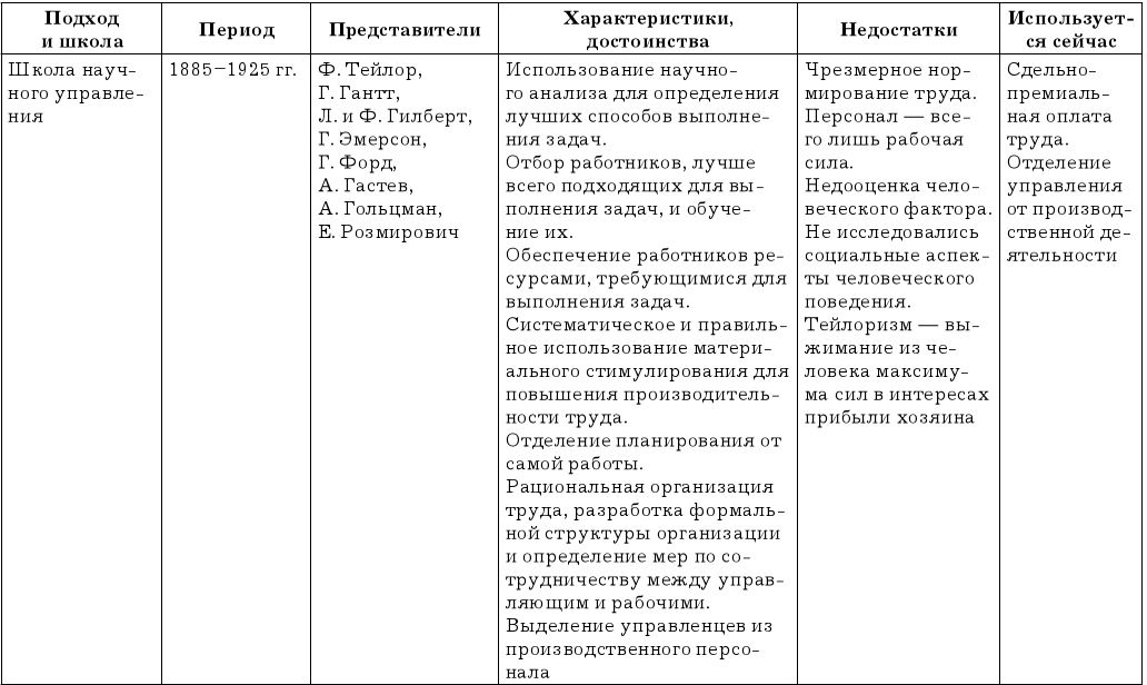 Школа научного управления (1885–1925 гг.). Становление и развитие этой школы, получившей широкую известность во всем мире под названием “научная организация труда”, совпали с началом XX в. (табл. 3.1). У истоков школы стоял американский инженер-исследователь Фредерик Тейлор (1856–1915 гг.), решавший в своей повседневной работе проблемы рационализации производства и труда с целью повышения производительности и эффективности. Учение его стало основным теоретическим источником современных концепций менеджмента.