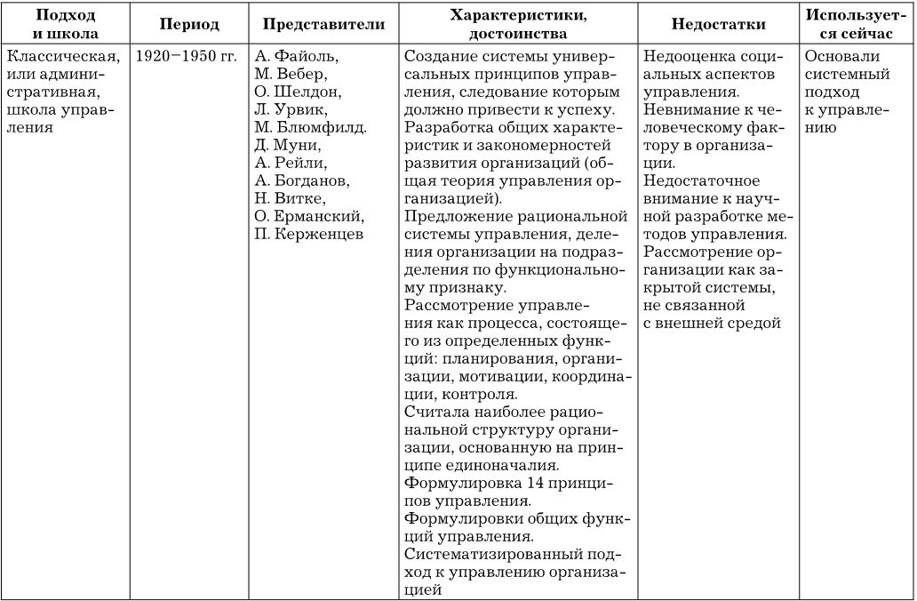 Классическая, или административная, школа управления (1920–1950 гг.). Наибольший вклад в ее развитие внесли французский ученый А. Файоль и немецкий социолог М. Вебер. Представители этой школы пытались определить общие характеристики и закономерности организаций.