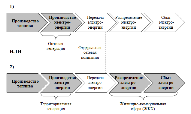 Пример. Рассмотрим некую условную компанию «Б», функционирующую на рынке электроэнергетики. Перед данной компанией стоит стратегическая дилемма: сконцентрировать внимание на оптовых генерирующих компаниях, ограничив свою цепочку создания стоимости рамками «производство топлива – производство электроэнергии», или стремиться к участию в территориальных генерирующих компаниях, выстраивая цепочку от производства топлива до распределения электроэнергии и тепла конечному потребителю (см. рис. ниже).