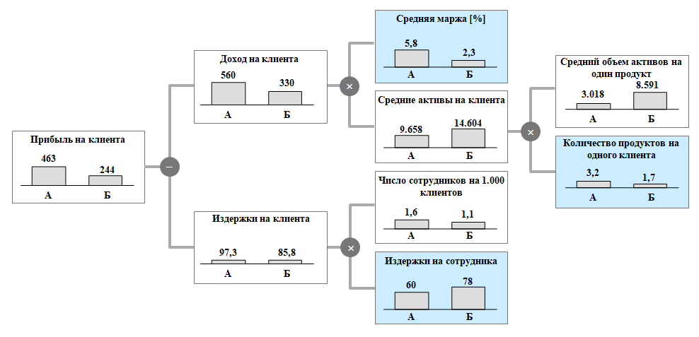 Рассмотрим представленное на рисунке ниже дерево факторов стоимости. Данное ДФС отражает сопоставление двух коммерческих банков с условными названиями «А» и «Б» по нескольким параметрам с целью конкретизации потенциала банка «Б» в части увеличения прибыльности его клиентской базы до уровня банка «А».