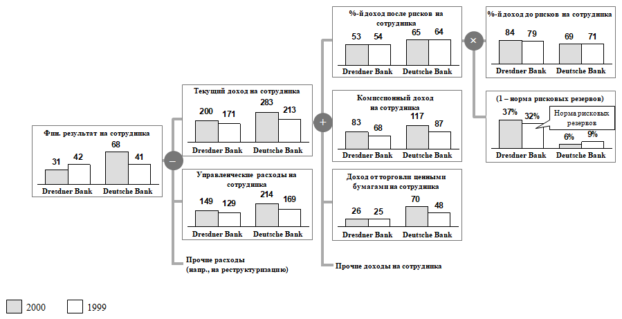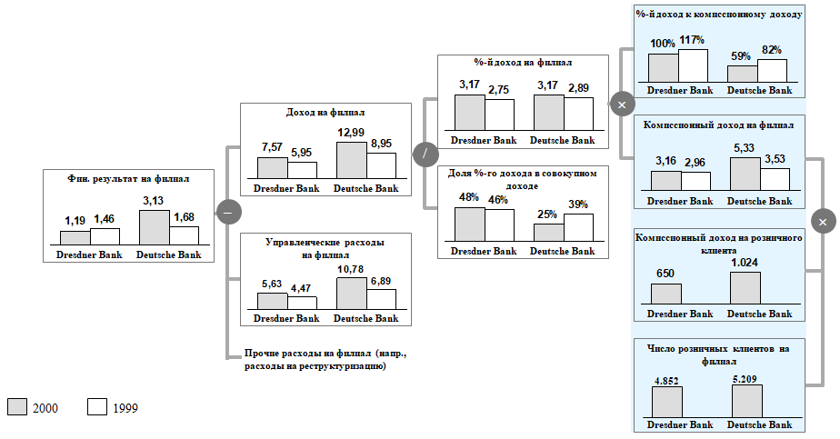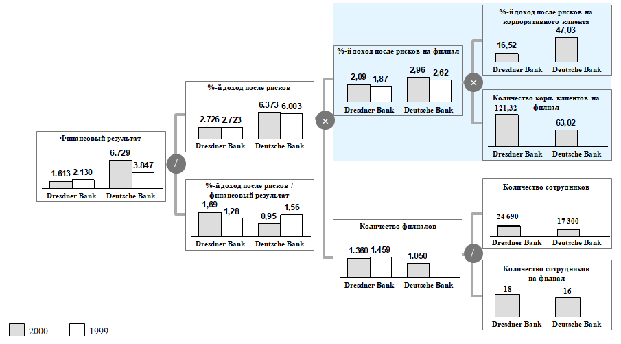 Дальнейший анализ кредитного дивизиона Dresdner Bank по сравнению с Deutsche Bank дал возможность выявить новые аспекты проблемы: Dresdner Bank имел в 2000 г. сравнительно более низкий уровень процентных доходов в расчете на один филиал, чем Deutsche Bank, за счет того, что клиентская база Dresdner Bank состояла из менее прибыльных компаний. Такой вывод позволяет сделать представление показателя [процентный доход после резервирования (= «после рисков») на один филиал] в качестве произведения двух сомножителей: [процентный доход после резервирования на одного корпоративного клиента] и [количество корпоративных клиентов на один филиал] – см. ДФС на рисунке выше.