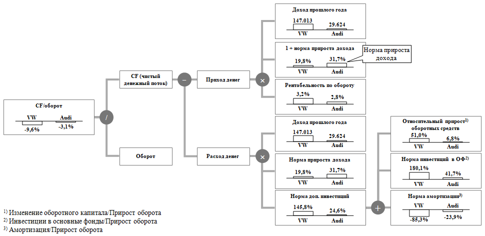 – основным фактором большего по модулю отрицательного денежного потока у Volkswagen является четырехкратное превышение нормы инвестиций в основные фонды и семикратное превышение нормы инвестиций в оборотный капитал, которые не компенсируются даже имеющим место четырехкратным превышением амортизационных ресурсов;