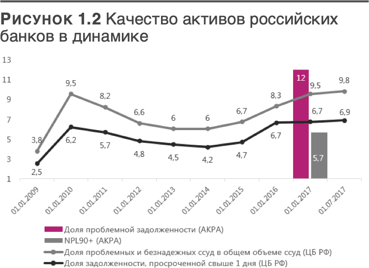 Низкое качество активов Кризис крупнейших финансовых организаций является главным источником риска снижения кредитоспособности российских банков. Уровень кредитоспособности оказывает существенное влияние на формирование процентных доходов, прибыли, требует образования резервов по ссудам, влияет на уровень рентабельности банковского бизнеса в целом. Для обеспечения условий для устойчивого и качественного роста банковской системы необходимо в первую очередь обеспечить сокращения уровня проблемной задолженности, как основного показателя качество активов. Уровень проблемной задолженности в банковской системе находится в диапазоне 12–15 %. Несмотря на восстановление экономической активности, доля проблемных кредитов на балансах банков продолжает рост, который начался в 2013 году. При этом официальный уровень проблемных ссуд максимален за последние десять лет. Кроме того, в банковской системе наблюдается низкий уровень покрытия резервами проблемной задолженности – ключевой краткосрочный риск снижения кредитоспособности российских банков. В целом по банковской системе проблемные кредиты зарезервированы чуть более чем на половину (51,7 %). Потенциальный негативный эффект от одномоментного признания полного обесценения проблемных кредитов оценивается в 2,5 трлн. руб. и может обусловить падение достаточности капитала банковской системы до пограничных регулятивных уровней. Более консервативная позиция Банка России в отношении уровня резервирования проблемных кредитов станет вызовом для банков в ближайшие 12–18 месяцев и в отдельных случаях может негативно повлиять на их кредитоспособность и уровень кредитных рейтингов.