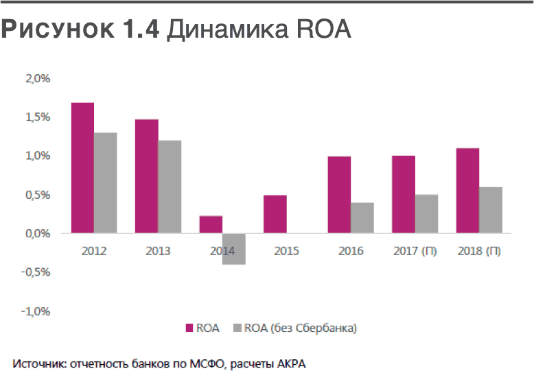 В 2017 году чистая прибыль банковской системы России по РСБУ незначительно снизилась по сравнению с 2016-м: рентабельность средневзвешенный активов (return on average assets, ROAA, расчет АКРА по данным ЦБ РФ) снизилась до 1,0 % по сравнению с 1,1 % в 2016 году, тогда как рентабельность собственных средств (return on average equity, ROAE) сократилась до 9,0 % по сравнению с 11,5 % в 2016 году.