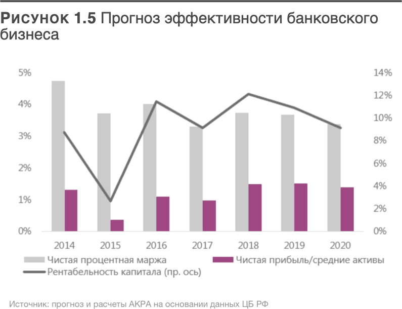 В 2017 году не достигнуто улучшения показателя ROA в целом по банковской системе, поскольку на совокупный финансовый результат серьезное негативное влияние оказал убыток крупнейших банков, оказавшихся в Фонде консолидации банковского сектора ЦБ РФ (Банк «ФК Открытие» и ПАО «БИНБАНК»). В 2018 году данный фактор будет, как ожидается, значительно меньше влиять на прибыльность отрасли. Однако на финансовый результат начнет оказывать влияние прогнозируемое сжатие NIM, и существенного повышения чистой прибыли в целом по системе не произойдет. АКРА отмечает, что стагнация и снижение NIM затронет не только малые и средние банки, которые не могут конкурировать по ставкам за счет эффекта масштаба, но и часть крупных и крупнейших универсальных банков со значительными портфелями проблемных кредитов, не генерирующих процентный доход, и/или с существенными непрофильными банковскими активами на балансе. В условиях сокращения процентного спрэда способность банковского сектора к генерации прибыли будет зависеть от того, насколько существенно банки смогут нарастить комиссионный доход и ужесточить контроль за операционными расходами. В конечном счете негативные тенденции в банковской системе ведут к сокращению возможностей банков обеспечить необходимый уровень капитала в соответствии с нормативными требованиями Банка России по созданию минимально необходимого уровня достаточности капитала, а также дополнительных буферов для обеспечения надежной защиты от кризисов и образования непредвиденных убытков. В среднесрочной перспективе ожидается снижение рентабельности капитала (см. рис. 1.5.)