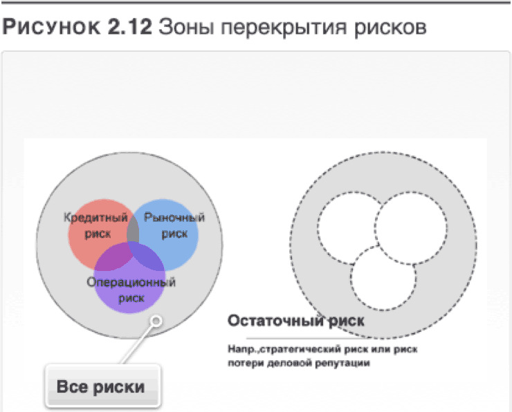 Финансовые риски, в свою очередь включают кредитный риск, рыночный риск, риски ликвидности и платежеспособности, реализация которых может при ненадлежащем управлении привести к убытку для банка. В свою очередь рыночный риск, который в значительной степени связан с волатильностью внешних финансовых рынков, включает фондовый, процентный и валютный риски. Разные виды банковских рисков тесно связаны друг с другом, что может существенно повлиять на общий профиль риска банка. Они имеют достаточно большие зоны перекрытия, а также зону остаточных рисков. Например, банк, осуществляющий валютные операции, как правило, подвержен валютному риску, но он окажется также под дополнительным риском ликвидности и процентным риском в случае, если в нетто-позиции по срочным операциям будет иметь открытые позиции или расхождения в сроках требований и обязательств. То, что не попадает в зону перекрытия пространства рисков кредитным, операционным и рыночным рисками является остаточным риском (рис 2.12, СМ).