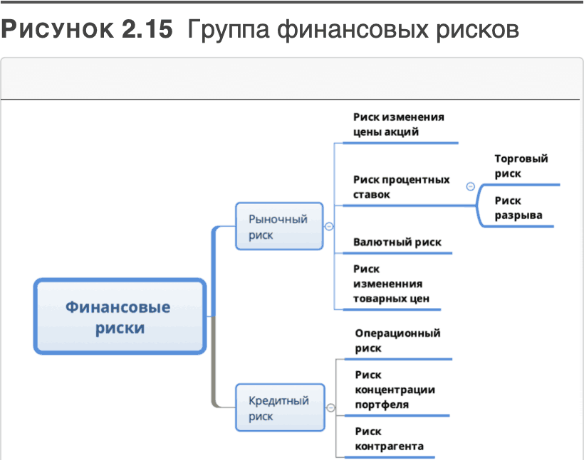 В группу финансовых рисков входят два существенных риска: это рыночный и кредитный риски, которые в практическом риск менеджменте нуждаются в большей детализации по категориям. Специфика рыночного риска состоит в том, что он всецело зависит от внешний факторов. Ошибка отслеживания его состояния является основной угрозой возможных финансовых последствий для банка. В связи с рыночным риском в риск-менеджменте используется такой такой популярный термин как базисный риск для описания возможности неблагоприятного соотношения между ценой продукта и ценой инструмента, используемого менеджерами для хеджирования (страхования) этого ценового риска (рис. 2.15, СМ).