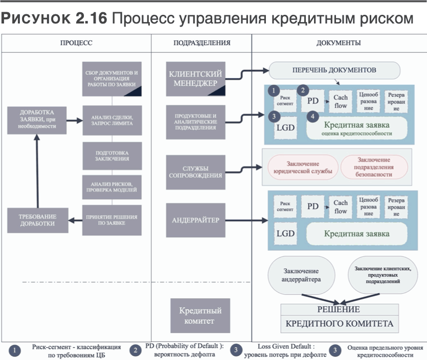 Кредитный риск самый значимый, многоуровневый, многоэтапный риск, которому банки уделяют наибольшее внимание. В кредитном процессе (рис. 2.16, СИ) задействованы практически все функциональные и линейные структуры банка, и конечно, риск-менеджмент.