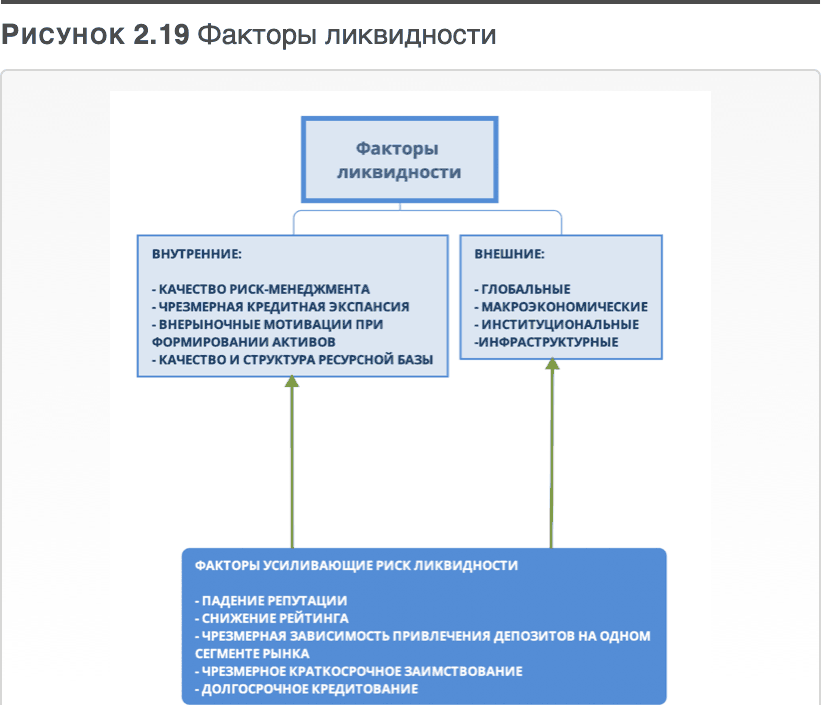 Существует множество ВНУТРЕННИХ и ВНЕШНИХ факторов, которые влияют на риск ликвидности. Один из главных факторов – это качество риск-менеджмента. К факторам, усиливающим риск ликвидности, можно отнести ПАДЕНИЕ РЕЙТИНГА И РЕПУТАЦИИ, способные спровоцировать панику у клиентов банка и, как следствие, «набег клиентов на банк» как во времена кризиса.