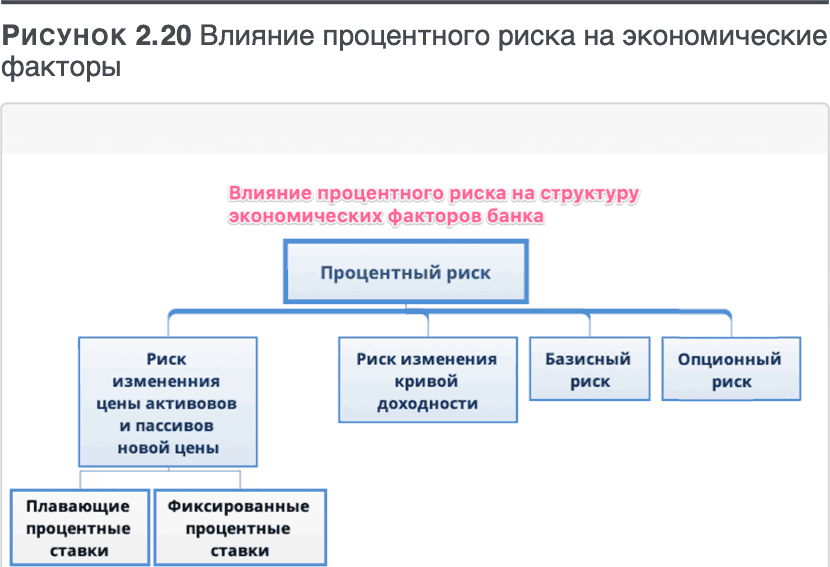 Процентный риск – риск возникновения финансовых потерь (убытков) вследствие неблагоприятного изменения процентных ставок по активам, пассивам и внебалансовым инструментам кредитной организации. Процентных риск определяется внешними факторами экономической среды, состоянием финансовых рынков (фондовых, валютных денежных). Вместе с тем процентный риск оказывает существенное влияние на внутренние категории (показатели, риск-метрики). В банках накоплен практический опыт снижения чувствительности активов и пассивов банка к процентному риску. Стресс-тестирование является важнейшим методом риск-менеджмента для выявления степени влияния процентного риска на финансовое состояние банка с целью создания оптимальных резервов для компенсации влияния процентного риска (рис. 2.20, СМ). Процентный риск является предметом практического риск-менеджмента в банке и рассматривается в материалах Модуля I более подробно.