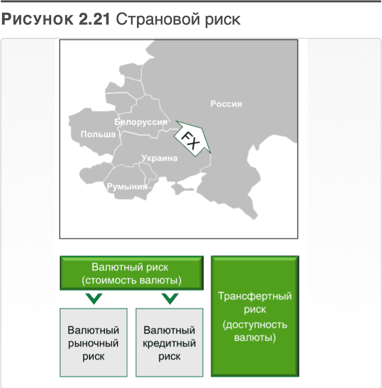 Возникает, так называемый, трансфертный риск, который отражает невозможность контрагентов определенной страны погасить свои обязательства в иностранной валюте по причинам отличным от стандартных рисков (по причинам зависящих от правительства страны, а не от контрагента).