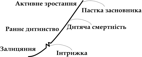 Зростаючи, компанії навчаються, чого не треба робити, завдяки неминучим хибам. Вони втягуються у процес навчання методом спроб та помилок, а коли помиляються серйозно – і втрачають частку ринку, великого клієнта чи гроші, – то опиняються на наступному етапі свого життєвого циклу. Велика криза лікує організації від зарозумілості. А величина успіху та зарозумілості організації, що активно зростає, визначає масштаб кризи, яка спонукатиме керівництво організації визнати необхідність правил та політик ведення бізнесу. Розроблення правил та політик свідчить про перенесення акценту на адміністративну підсистему та перехід до наступної стадії розвитку – Юності43. Нездатність сфокусуватися на адміністративній системі вказує на патологію під назвою «пастка засновника» (Founder’s Trap™)44.