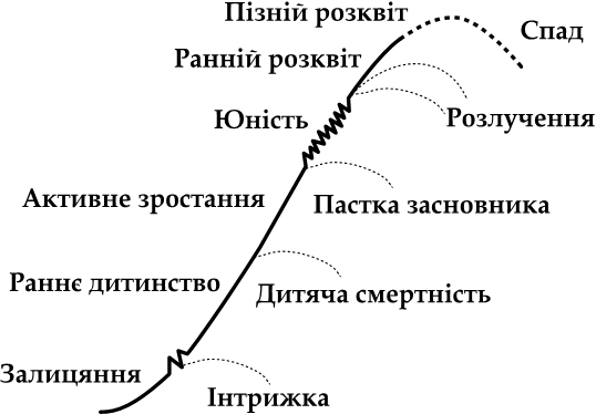 Що відбувається? Організація-немовля зосереджена на продукті; організація, що активно зростає, – на продажах; юні організації фокусуються на системах та адмініструванні. По черзі дбаючи про ці нагальні потреби на кожній новій стадії, організації зростають і навчаються доти, доки у період Розквіту на перший план не виходить питання глибини управлінської ієрархії.
