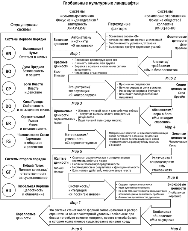 Мы предлагаем читателям познакомиться с различными архетипами, организационными моделями и иллюстрациями того, как каждый код препятствует различным способам генерирования идей и интеграции. Далее следует сделать акцент на то, как различные коды ставят разные жизненно важные вопросы – и ни один из кодов не лучше и не предпочтительнее остальных. Как говорил Грейвз, ни одна из ценностных систем не лучше другой. Он подчеркивал, что наилучшей системой для данных конкретных условий будет та, которая в наибольшей степени им соответствует.