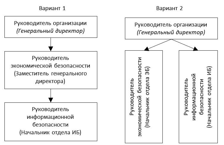 Подсистема информационной безопасности может быть включена в систему экономической безопасности или быть самостоятельной системой. В первом случае иерархия управления информационной безопасностью осуществляется через руководителя экономической безопасности, во втором случае руководитель информационной безопасности будет подчинен руководителю организации. На рис. 2.4 представлены варианты управления информационной безопасностью организации.