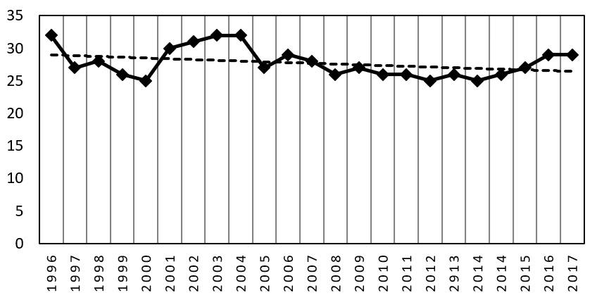Рис. 2.5. Динамика индекса восприятия коррупции в России в 1996–2017 годах
