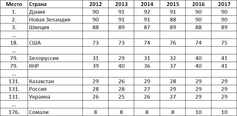 Рейтинг стран по индексу восприятия коррупции, рассчитанный Transparency International