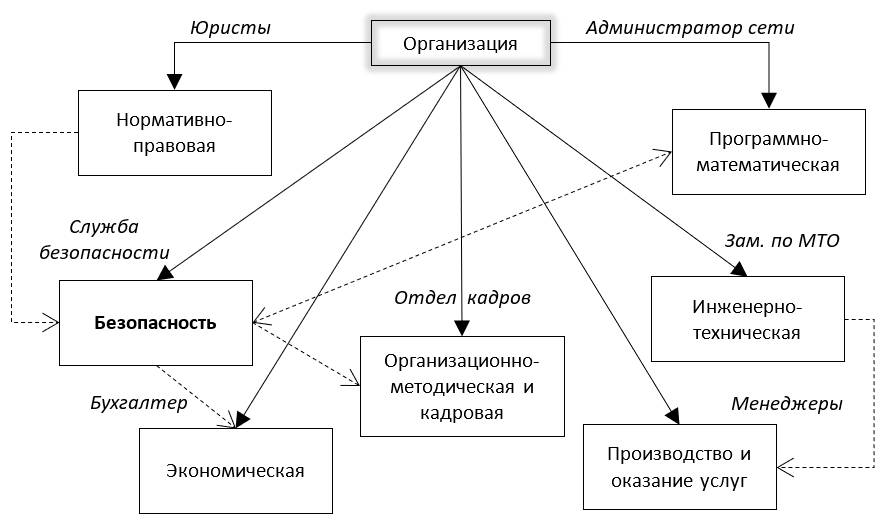 Тесное переплетение службы экономической безопасности с другими подсистемами организации обусловлено единством целей. Процессы, проходящие в организации, тесно переплетены между собой, например, кадровые службы обращаются к службе безопасности для сбора информации о новых сотрудниках и, в тоже время, сами являются инициаторами формирования кадров для системы безопасности.
