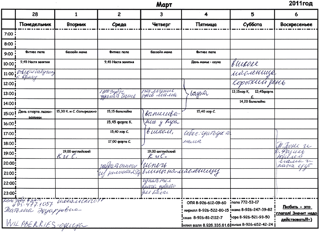 Этот листок создается в Excel, распечатывается каждую неделю и вывешивается на доску. Редактируется тогда, когда меняется расписание. Потом на этом листочке от руки вписываются разные дела. А нижняя часть получилась по «недоразумению»: никак не могли распечатать так, чтобы расписание занимало всю страницу – оставались пустые места. В итоге им нашли такое применение: телефоны всех домашних, афоризмы и место для записи, когда что-то сообщают по телефону, или что-то надо из головы «выплеснуть», чтобы это не потерялось. Это расписание у нас живет уже пятый год.