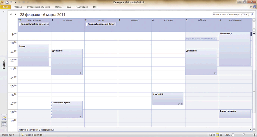 Очень удобно использовать для недельного совместного планирования распечатку недели из Microsoft Outlook. Я провела одну субботу в обнимку с книгой Глеба Архангельского по работе с Microsoft Outlook, настроила почту и существенно экономлю время! Вот так может выглядеть ваша неделя на холодильнике (при этом все формируется автоматически – очень удобно – внесены только жесткие встречи / повторяющиеся встречи / дни рождения автоматом). Все остальное дописываем от руки!