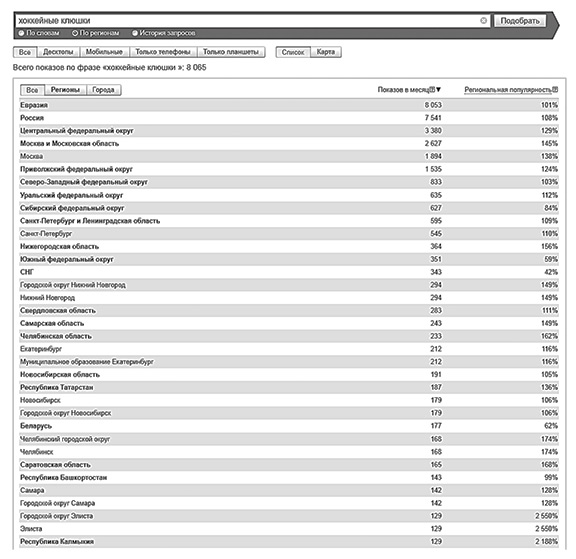 Обратите внимание: нам нужны запросы со словом «купить», брендированные запросы — с конкретной моделью или фабрикой — и запросы вроде «клюшки цена». В общем, просто постарайтесь понять, что у человека в голове, когда он вбивает эти слова. Можно получить раскладку по стране: