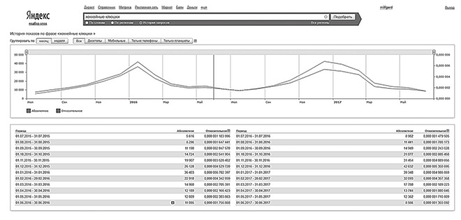 1. Мониторится топ-100 товаров Google по сфере (через сервис Shopping) и аномалии в поиске «Яндекса» через уже упомянутую статистику ключевых слов. Есть и более специализированные инструменты, облегчающие сбор информации по сотням запросов. В итоге мы так видим западный товар, который через полгода будет популярен в России.
