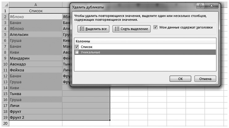 Если же дубликаты нужно удалить, а не выделить, то выделите таблицу (в данном примере дубликаты предварительно выделены) и нажмите на кнопку «Удалить дубликаты» в разделе «Данные». В появившемся окне укажите, в каком именно столбце ищем дубликаты:
