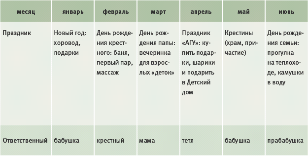 3. Мы зафиксировали идеи праздников под названием каждого месяца в общей таблице на предстоящий год (см. образец ниже). Таким образом, получили календарь на год с праздниками для семьи (один в месяц).