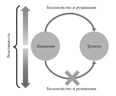 Как показано на рисунке 2.1, когда люди постоянно реагируют на свои мысли и обстоятельства, усиление внимания приводит к усилению тревоги и руминации, которые в конечном итоге повышают уровень тревожности. Также становится ясно, что, когда люди не чувствуют сильной потребности быть реактивными, усиление внимания не сопряжено с тревогой и руминацией, а значит, общий уровень стресса понижается. Давайте посмотрим, как эта модель применима к вашей повседневной жизни.