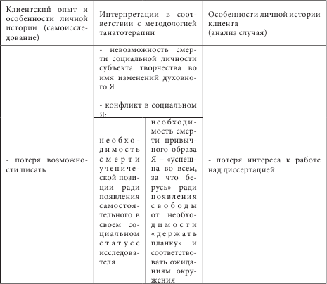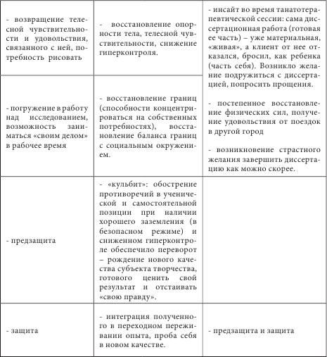 3. Особенности работы в танатотерапии позволяют снизить сверхконтроль сознания, препятствующий переходу то ставших неэффективными, отработанных субъектом творческой деятельности способов достичь творческого состояния сознания или справиться с его отсутствием, к новым и воспринимающимся как «потеря себя», смертельным изменениям, обеспечивающим переход на следующий уровень творческого развития. Благодаря этому появилась возможность «прочитать собственную работу как художественную литературу» (по-новому) – в первом случае и изменить отношение к готовой части диссертации – во втором.