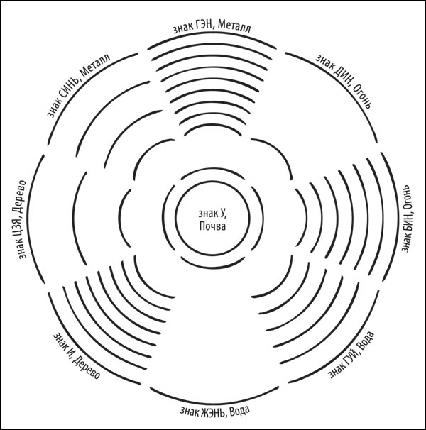 Итак, в основу Ло Шу положен закон преодоления противотоком (непокорностью, движением против потока). Преодоление (превозмогание) противотоком – это преодоление ян посредством инь с перемещением вправо. Потому Почва середины преодолевает Воду на севере, Вода на севере преодолевает Огонь на западе, Огонь на западе преодолевает Металл на юге, Металл на юге преодолевает Дерево на востоке, Дерево на востоке преодолевает Почву в центре.
