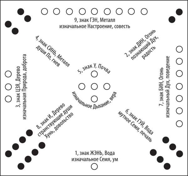 Семерка является числом янского Огня. Когда Огонь занимает положение Металла, Огонь сталкивается с Металлом и, попадая в хранилище[35], обращается в Металл. Девятка – это число янского Металла. Когда Металл занимает положение Огня, Металл встречается с Огнем, в результате чего происходит рождение света и возвращение (обращение) в Первоначало. Огонь обращается в истинность, и посленебесное Дыхание полностью преображается. Металл возвращается в Первоначало, и прежненебесное Дыхание поворачивает вспять против потока. Так происходит непрерывное порождение жизни (рождение рождения, проживание жизни). Доброта, Совесть, Поведение и Ум находят свой корень (основу) в единой Вере, а Металл, Дерево, Вода и Огонь возвращаются в срединную Почву. Таким образом Пять Движений группируются и стягиваются, и на этом этапе схема Ло Шу уже оказывается превращенной обратно в схему Хэ Ту.