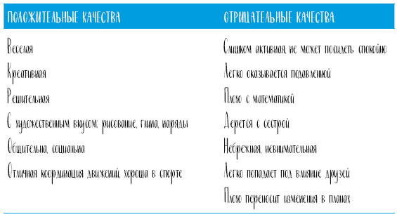 2. Теперь прочитайте описание и подчеркните положительные и отрицательные качества вашего ребенка. Вы составите два списка. В первом будут все положительные черты, таланты, способности, интересы, потенциальные области развития, о которых вам хочется позаботиться. В другой список вы включите отрицательные качества, ограничения, потенциальные проблемы и плохие привычки.