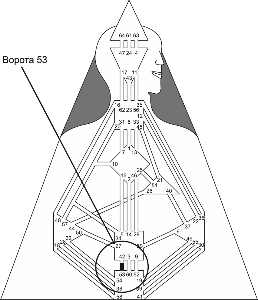 Энергия Ворот 53 (рис. 103) дает толчок для начала творческого процесса. Также через этот Канал мы получаем успешный опыт либо способность мотивировать других. Ворота 53 полны хороших задумок, однако их работа заканчивается уже на этапе начала проекта. У носителя такой энергии в доме наверняка найдется множество недоделок.