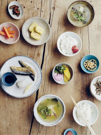 Традиционный японский завтрак из горячего гохана (рис), цукемоно (японские соленья), мисосиру (суп мисо) и несколько тамаго каке гохан (горячий приготовленный на пару рис с яйцом, разбитым сверху) или тамагояки (японский омлет).