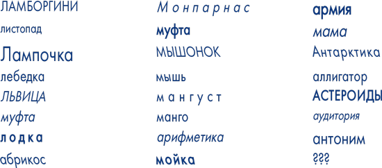Гурий – это островерхое сооружение из камней. Люди оставляли их на своем пути с тех самых пор, как начали заселять планету – и этим помогали новым путешественникам находить верную дорогу. Выберите букву – возможно, ту же, что и на предыдущей странице, – и соберите слова, которые с нее начинаются. Запишите их одно выше другого. Абрикос может удержать на себе Антарктику. Лампочка может удержать на себе Ламборгини. Поставьте маму у подножия горы Монблан. Постройте гурии разной формы, указывая путь на следующую страницу. Или добавляйте слова к тем, которые приведены внизу. Не заботьтесь о том, чтобы они были ровными и сохраняли равновесие. Подбросьте побольше у основания. Накидайте сбоку. Стройте качающиеся башни и почти падайте, но все-таки держитесь. Используя слова одного из ваших гуриев, напишите рассказ или стихотворение о том, как вы потерялись, а потом нашли дорогу домой.