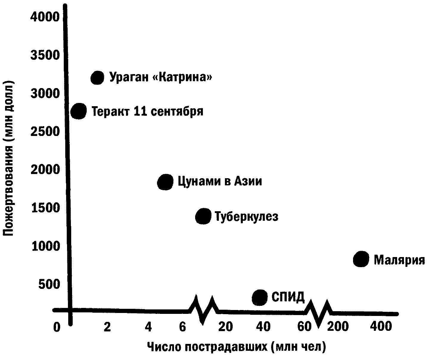 Для того чтобы задуматься о проблеме неправильного распределения ресурсов в более глобальном смысле, обратите внимание на график, приведенный ниже[99]. На нем отмечены суммы пожертвований, связанных с целым рядом катастроф (ураганом «Катрина», террористическими актами 11 сентября, цунами в Азии, туберкулезом, СПИДом и малярией), а также число людей, напрямую затронутых этими трагедиями. График однозначно демонстрирует, что по мере роста количества жертв сумма благотворительных взносов снижается. Также можно заметить, что трагедии, затронувшие США (ураган «Катрина» и террористические акты 11 сентября), вызывали значительно больший приток благотворительных взносов по сравнению с прочими (например цунами). Наибольшее беспокойство в этой ситуации вызывает тот факт, что на профилактику таких заболеваний, как туберкулез, СПИД и малярия, направляется слишком мало средств по сравнению с масштабом возможных эпидемий. Вероятно, пассивность связана с тем, что профилактика направлена на спасение еще не заболевших людей. Спасение гипотетических людей от гипотетических болезней кажется нам слишком абстрактной и далекой целью, не вызывающей у нас эмоций и не способной заставить нас открыть свои кошельки.