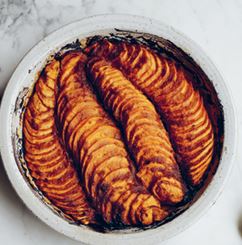 Аккуратно под углом порежьте картошку на чипсы толщиной 1/4–0,6 см. Выложите вашу сладкую картошку в подготовленную тарелку и полейте сверху маринадом. С помощью кисточки для выпечки равномерно распределите маринад. Накройте алюминиевой фольгой, и пусть ваша картошка маринуется при комнатной температуре примерно 30 минут.