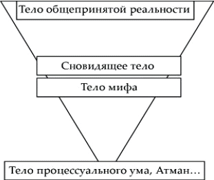 Цель сегодняшнего занятия: выяснить природу телесного опыта этого процессуального ума. Иными словами, понять кто вы с перспективы вселенной. Но сперва взгляните на точку внизу схемы (рис. 27). На самом верху находится «реальное тело», то есть тело, о котором всякий говорит и приносит его к врачу. В средней части треугольника находится «сновидящее тело», а за ним – «тело мифа». В самом низу треугольника, в области сущности, помещается опыт «тела процессуального ума», «Атман», «Брахман» и… – это означает, что для этого понятия есть множество других имен. Я написал там «наименьшее действие»; я буду последовательно объяснять каждый термин.