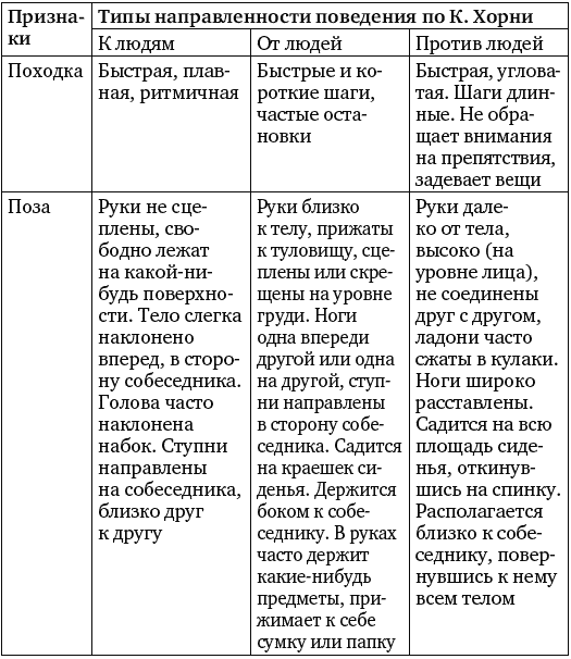 И. Л. Соломин предлагает схему наблюдения, позволяющую диагностировать направленность поведения человека в качестве типа его личности, опираясь на типы направленности поведения по К. Хорни. В процессе наблюдения за поведением партнера могут регистрироваться такие признаки, как походка, поза, жесты, мимика, взгляд, речь, язык, одежда и общий стиль поведения. В случае если большинство этих признаков соответствует какому-либо одному из трех типов направленности поведения, можно сделать предположение о том, что он характеризуется соответствующим типом направленности поведения по теории американского психоаналитика К. Хорни. «В своей книге «Наши внутренние конфликты» К. Хорни разделила список из десяти потребностей на три основные категории. Каждая из категорий представляет собой стратегию оптимизации межличностных отношений с целью достижения чувства безопасности в окружающем мире. Иначе говоря, их действие заключается в снижении тревоги и достижении более или менее приемлемой жизни. Кроме того, каждой стратегии сопутствует определенная основная ориентация в отношениях с другими людьми» (Л. Хьелл, Д. Зиглер. Теории личности. СПб.: Питер, 1997).