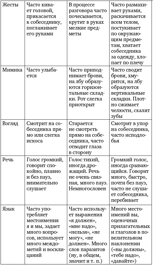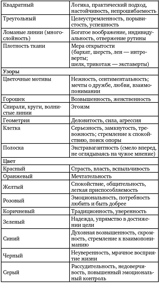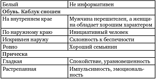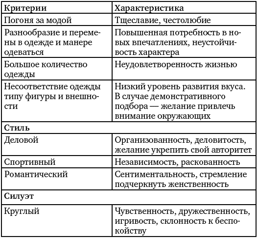 В таблице № 2 приведены основные критерии и их характеристики для диагностики личности по внешнему виду. Хотелось бы отметить, что этот материал был взят из журнала Journal of Personality and Social Psychology и переведен, поскольку наши соотечественники уделяют такому вопросу очень мало внимания. Важно заметить, что в последнее время в электронных ресурсах появляется довольно много публикаций на тему: «О чем расскажет одежда», но, тем не менее, информация везде настолько поверхностная, что использовать ее в качестве материала для работы невозможно. В статье авторов Ч. Джуд, Д. Довидио, Ч. Кавер был сделан акцент на том, что данные, приведенные ниже в таблице, – это некое заключение наблюдений и видеозаписей, которые велись в течение трех лет. Однако обоснования и доказательства этим фактам нет.