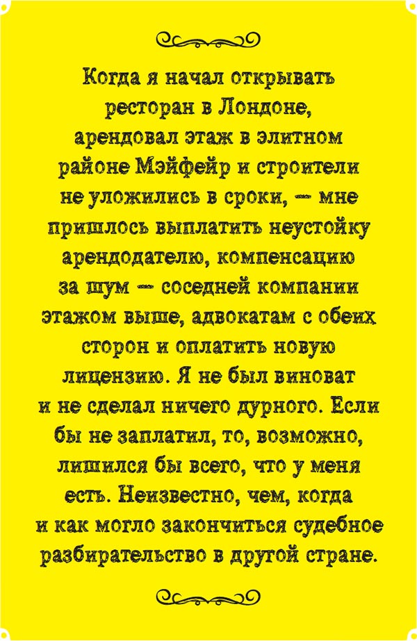 Сейчас в ресторане работает триста человек. Он окупился за три года. Управляют заведением только местные менеджеры. За это время я научился понимать, чем западный бизнес отличается от российского. В Англии все абсолютно по-другому. Не дай бог сказать человеку плохое слово. Тебя сразу засудят по максимуму. Ни в коем случае нельзя ругаться. Как-то повар назвал менеджера «французским педерастом», тот написал заявление, начались разбирательства, повара отстранили от работы на месяц, а могли вообще оштрафовать и выгнать. Здесь все застраховано и перестраховано. Если кто-то обжегся, упал или случилось еще что-то, ждите огромных штрафов. Однажды к нам пришла полиция, человек двенадцать, потому что кто-то написал, что в ресторане работают русские без рабочей визы и разрешения на работу. Это был настоящий захват, но недоразумение удалось урегулировать, так как ни одного русского среди сотрудников не нашлось.