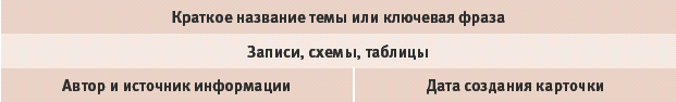 5. Бывает, что ребенку случайно попадается интересная информация, вроде бы ни к какому конкретному его занятию не относящаяся. Например, он читает какую-то статью в Интернете и встречает там любопытную статистику, или цитату, или интересный исторический факт. И в данный момент ребенку эта информация вроде бы ни к чему, но сама по себе она очень любопытна и познавательна. Как правило, ребенок эту информацию не фиксирует, и она забывается. Это и с нами, взрослыми, случается сплошь и рядом. А через некоторое время вдруг понимаем, как уместна была бы сейчас эта информация, а ее уже нет. Так и наш ребенок, когда пишет сочинение или готовит проект по обществознанию, вдруг понимает, что эта информация была бы очень кстати. Но, увы, несмотря на длительные поиски, ее так и не удается найти. Поэтому информацию такого рода необходимо записывать. Но где ее записывать, к чему ее привязать, чтобы не забыть в нужный момент? Для таких случаев очень удобна картотека с карточками интересных мыслей и фактов. Карточка выглядит следующим образом: