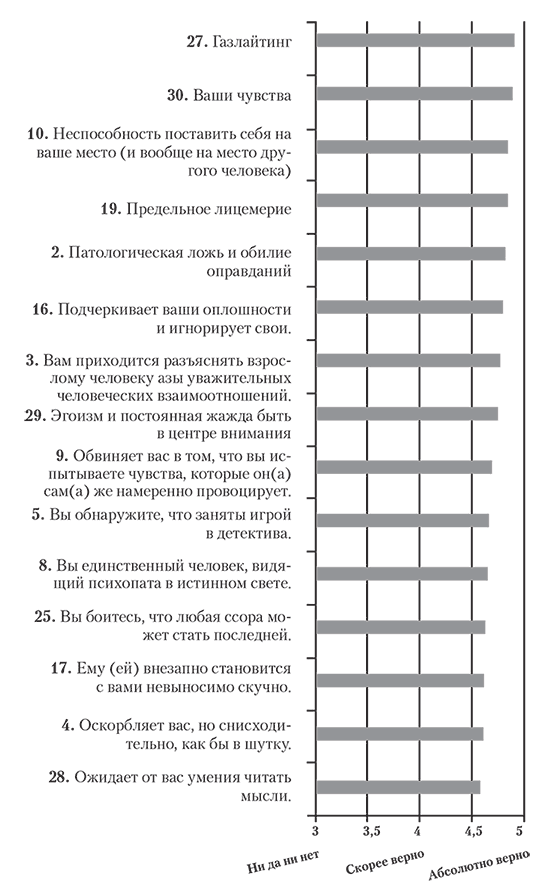 Можете представить себе мое удивление, когда оказалось, что своим опытом поделились более тысячи жертв психопатического абьюза! У всех «красных флажков» большинство ответов оказалось «Совершенно верно». Я был в шоке. Но некоторые описания все же получили более низкую оценку, чем другие, и я решил пересмотреть их и улучшить для новой книги. Обновленное описание «красных флажков» в этой книге составлено на основе фраз, которые чаще всего встречаются в ответах жертв абьюза со всего мира. Как и все, что я пишу, этот список постоянно совершенствуется. Я приглашаю и вас поделиться опытом и покритиковать мой список на сайте Survey. PsychopathFree.com.