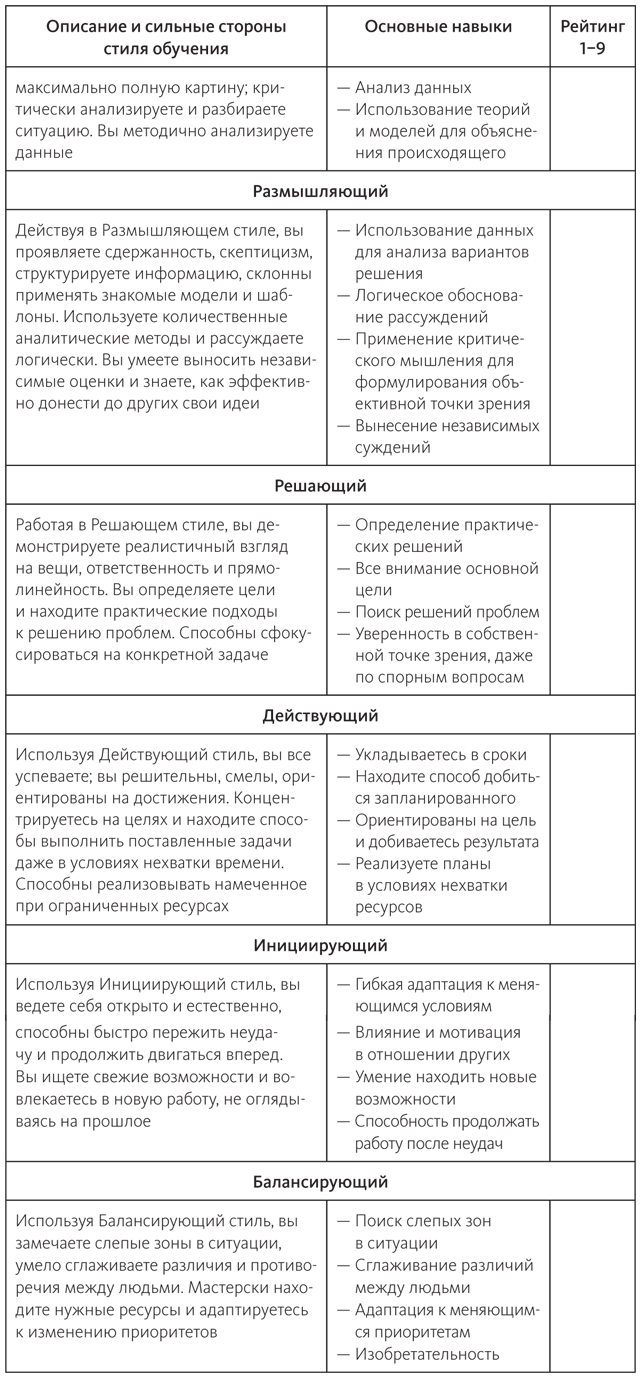 Прочтите полное описание каждого из девяти стилей обучения и постарайтесь определить, что из них предпочитаете, какие используете в качестве запасных и чего стараетесь избегать. Реализуя цикл познания, мы склонны начинать с любимого и наиболее комфортного стиля и при серьезном стрессе применять именно его. Более подробную информацию о возможностях каждого стиля вы найдете в приложении Б.