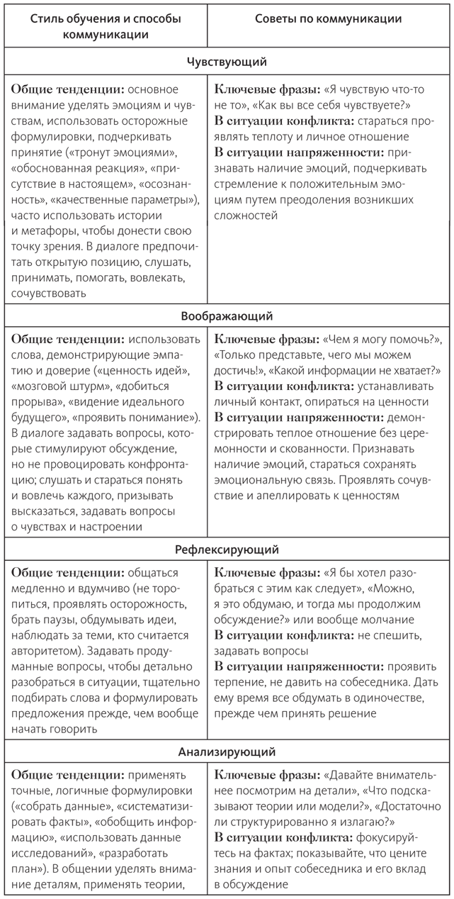 Стили обучения помогают объяснить разницу в подходах разных людей к коммуникации. Те, кто предпочитает Чувствующий, говорят о переживаниях и рассказывают истории; те, кому ближе Размышляющий, придерживаются фактов и достоверных данных, не принимая в расчет эмоции. В зависимости от выбранного подхода к обучению люди по-разному строят сообщения. К примеру, приверженцы Решающего стараются основной акцент в посланиях делать на практических результатах; любители Воображающего не спешат с решениями и уделяют много внимания обсуждению новых идей. Так что неудивительно, что коллеги с разными подходами к познанию часто не могут ни о чем договориться.