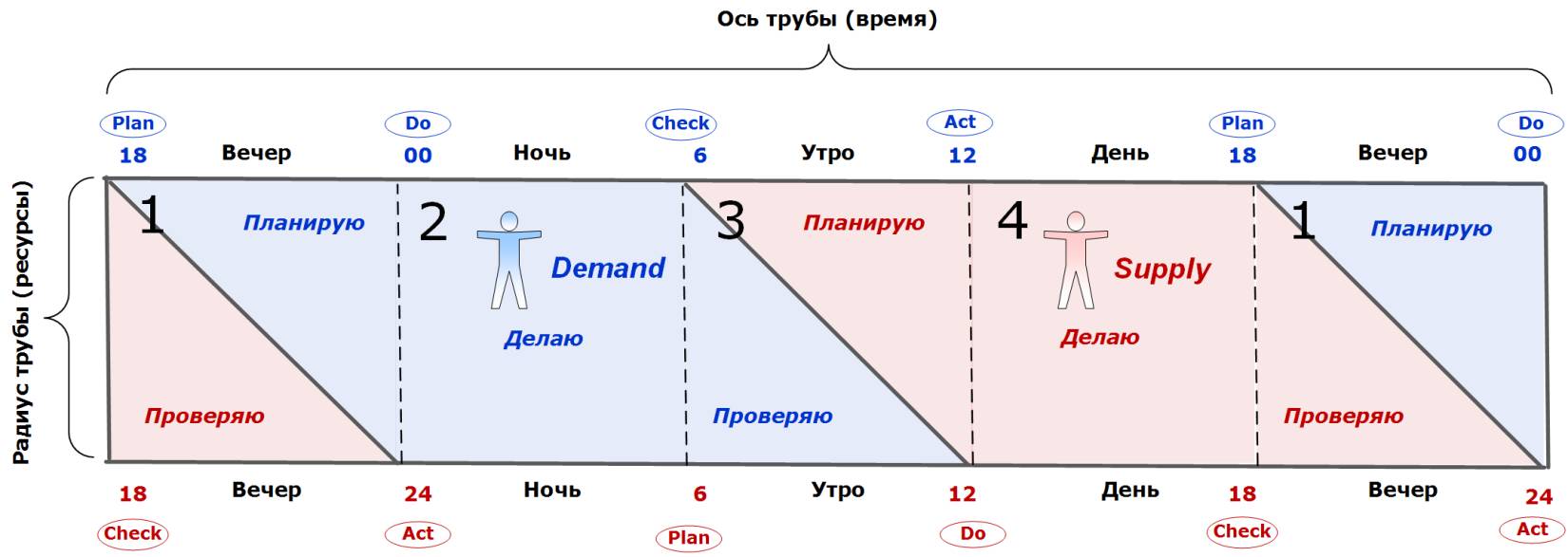 Не стоит ничего изобретать! Природа сама об этом давно позаботилась! Круговое движение двух полярных активностей Demand и Supply поддается тем же законам, что и суточное вращение Земли вокруг своей оси. Это своего рода 24-тактовый циферблат, проходящий 4 фазы движения: Утро, День, Вечер и Ночь. Обратите внимание, насколько органично вписался сюда цикл PDCA!