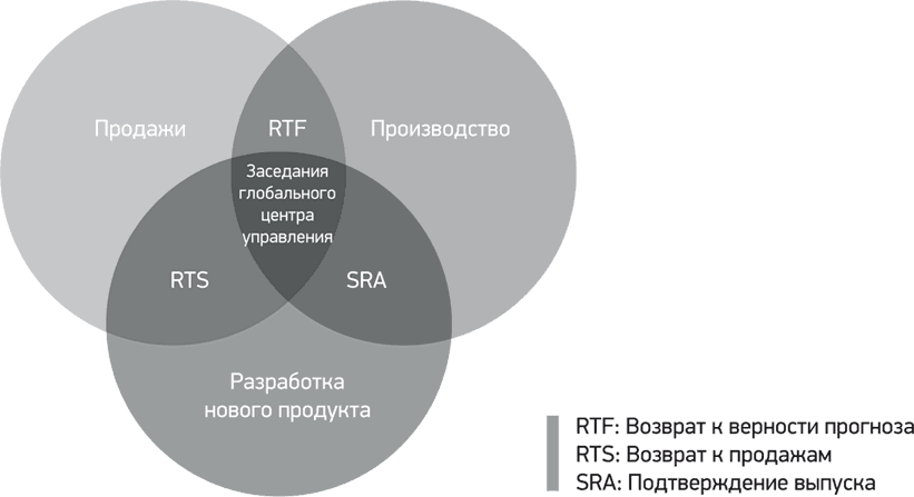 Таким образом SCM объединяет все необходимые данные и рассчитывает индексы, которые относятся к системе поставок. Один из них – «возврат к прогнозу» (return to forecast, RTF) – оценивает, насколько производство удовлетворило требования продаж. Другой – «подтверждение выпуска» (shipment release approval, SRA)[70] – указывает на то, когда новая разработка будет готова к производству. Третий – «возврат к продажам» (return to sales, RTS) – определяет, когда новый продукт поступит в сбытовую организацию (см. рисунок 4.6).