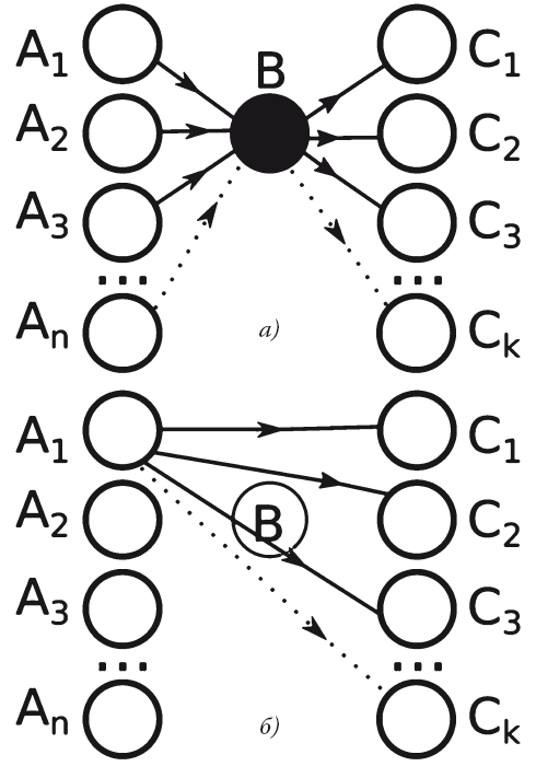 б) Попытка избавиться от нейрона В, соединяя группы нейронов А и С по принципу «каждый с каждым».