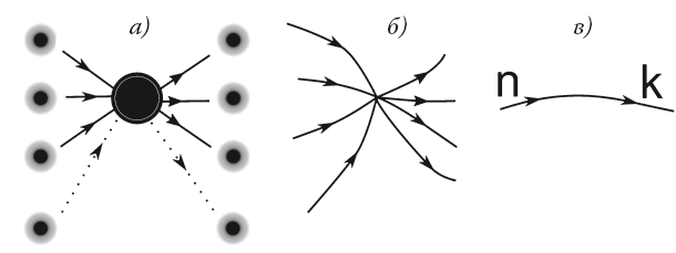 а) Пучок нейронов n на k, фокусирующийся на нейроне В.